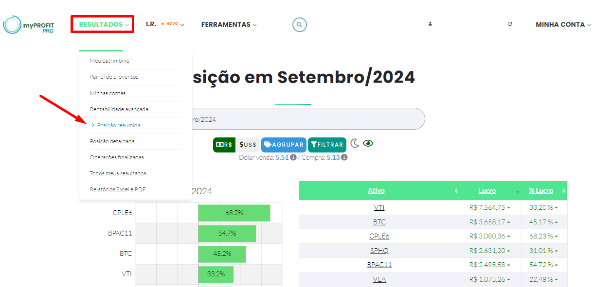 Você só precisa efetuar o login na plataforma e selecionar a opção "RESULTADOS" -> POSIÇÃO RESUMIDA, no canto superior esquerdo da página, conforme imagem a seguir: